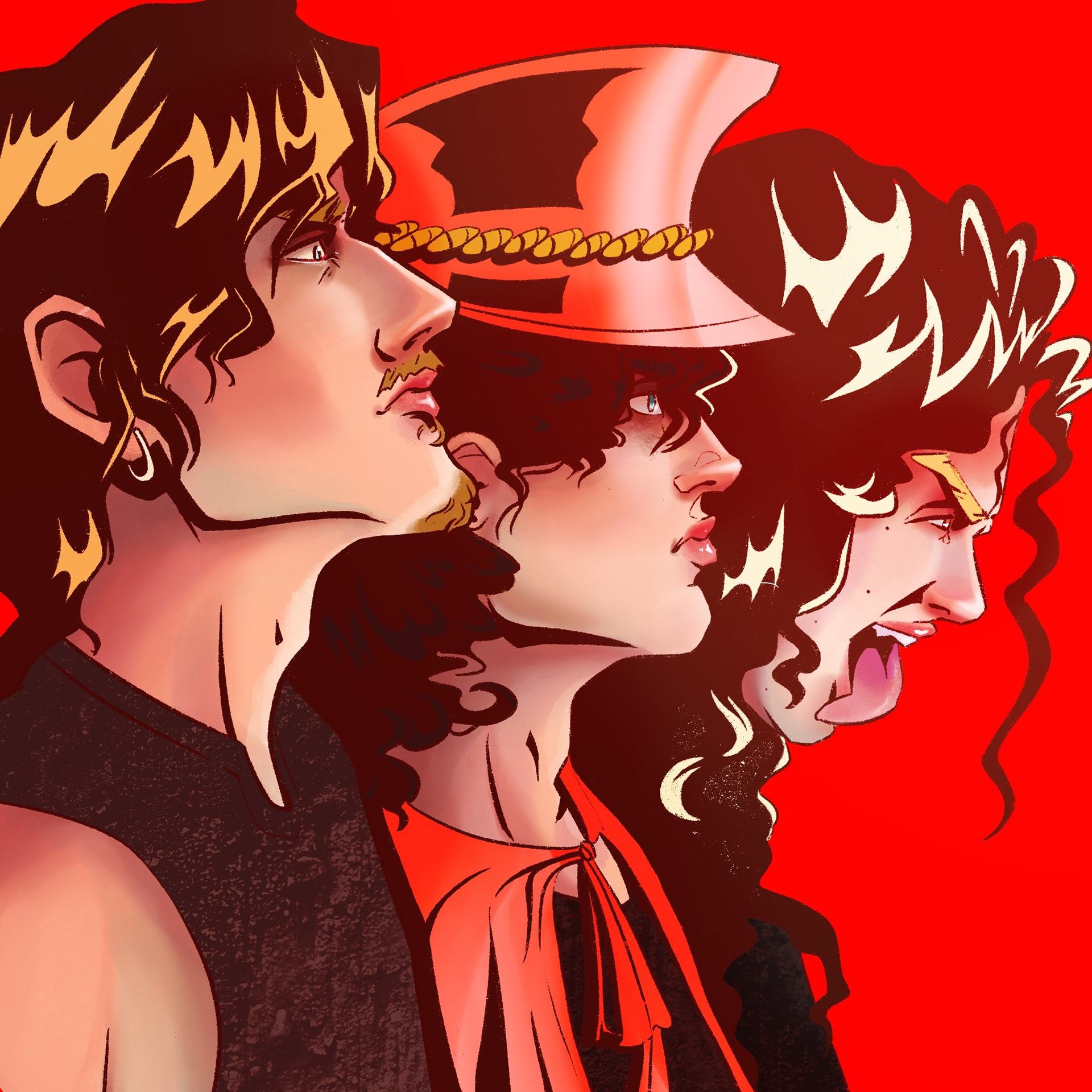 I had an idea of my friends in the band Bastardane where they were all in profile slowly tipping their heads down–it was too good to not create as each member has such a distinct style and stage presence, perfect for a character study! No reference, just the imagination.